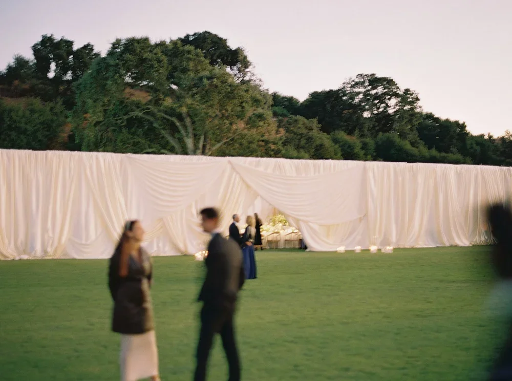 I had one frame left on my medium format camera as the light dropped. The drapery installation sat in the distance like an art piece, with guests still at cocktail hour, aware of it, anticipating what was coming next. The low light introduced this softness, blurring the edges in a way that echoed the drapery itself, and the way it cuts through the center of the frame gave it that sense of structure. It holds both moments at once, where they are and what is about to begin.