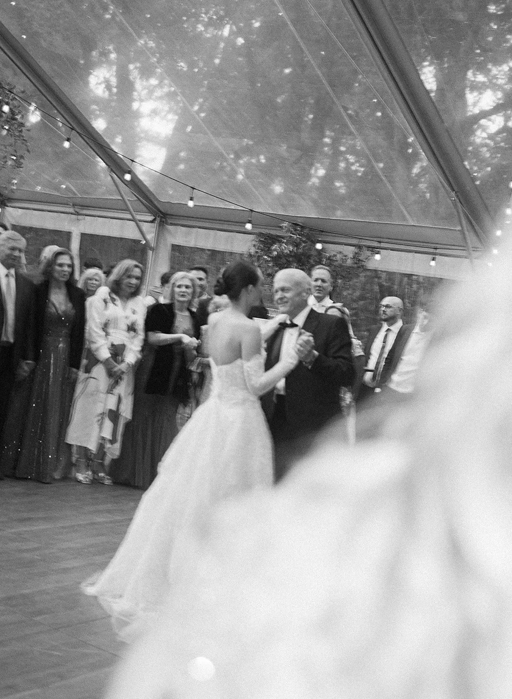 I shot the entire wedding on film, which let me stay present and trust what I was seeing. Her first dance with her dad, framed over the shoulder of the groom’s mom waiting to go next, held a different kind of weight for me. Some photographers see this moment through the bride, but I see it through the parent, the years that led here, the quiet knowing of what it means as it happens.