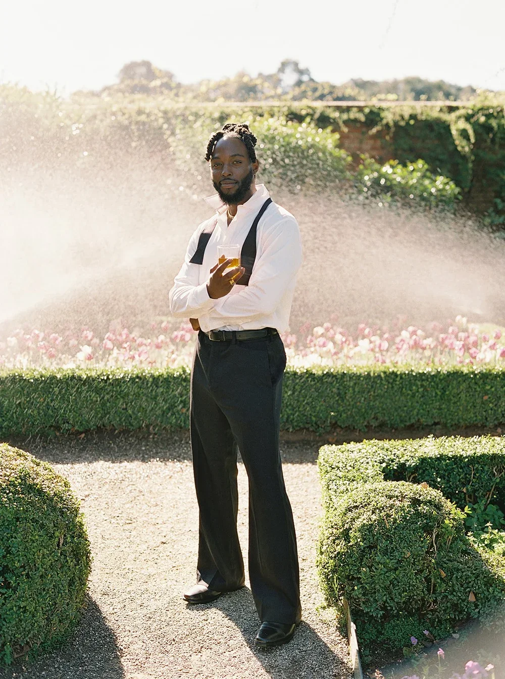 As we were shooting this at Filoli, the sprinklers started going off in the distance and I chose to keep them in instead of working around them. They created this soft haze behind him, something you don’t immediately understand, almost like rain but not quite. I kept him grounded and still against it, letting that contrast carry the image, something controlled set against something unpredictable.