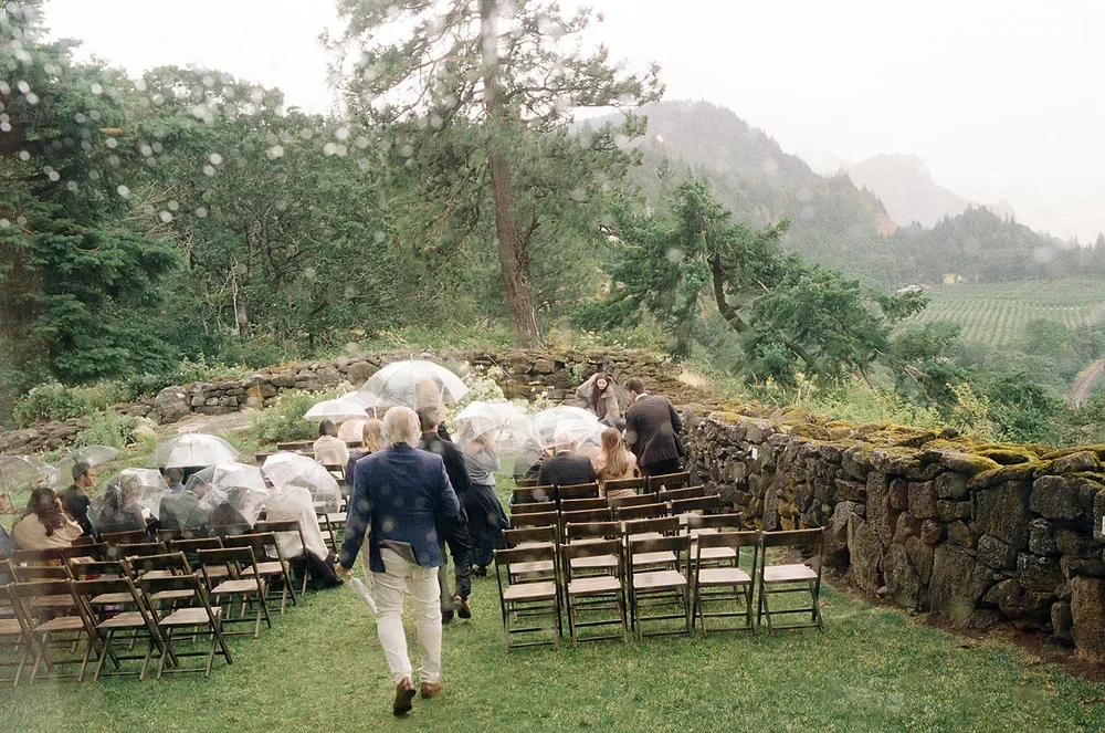 I stayed inside and shot through the window as guests arrived, letting the raindrops on the glass pull the rain forward. It made the moment feel more intense, a little wild, instead of something to hide from.