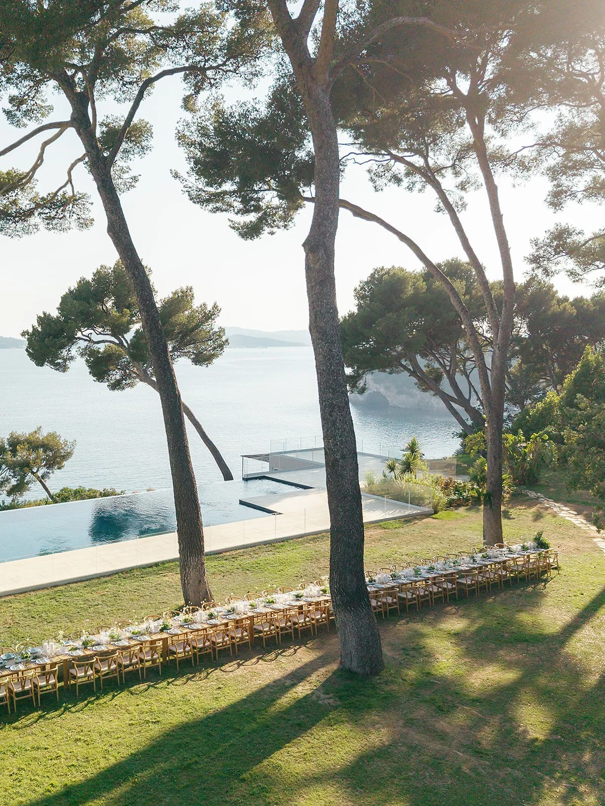 The rehearsal dinner in the south of France felt grounded in simplicity, one long table beneath the trees, nothing overdone. The design led the image, so I stepped back and let the space speak, the scale of the trees, the line of the table, the stillness of it all.