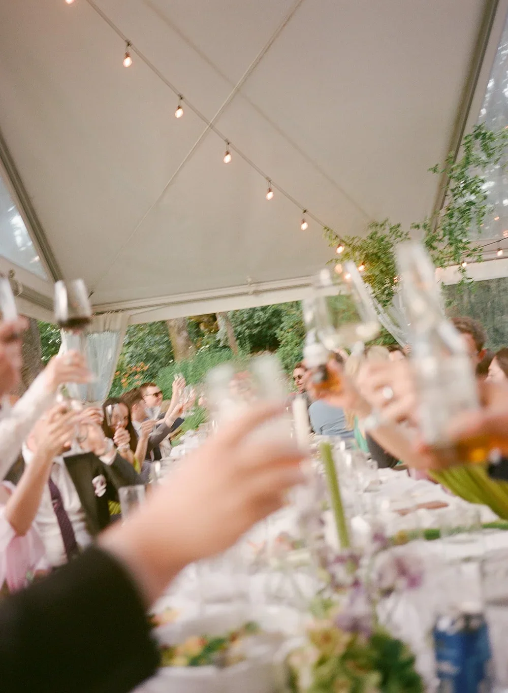 I shot this on medium format to hold the depth of the space and the warmth of the lights as they started to take over at sunset. The clear tent, layered guests, and lanterns all working together to make the room feel full and alive without losing the feeling of the sky above.
